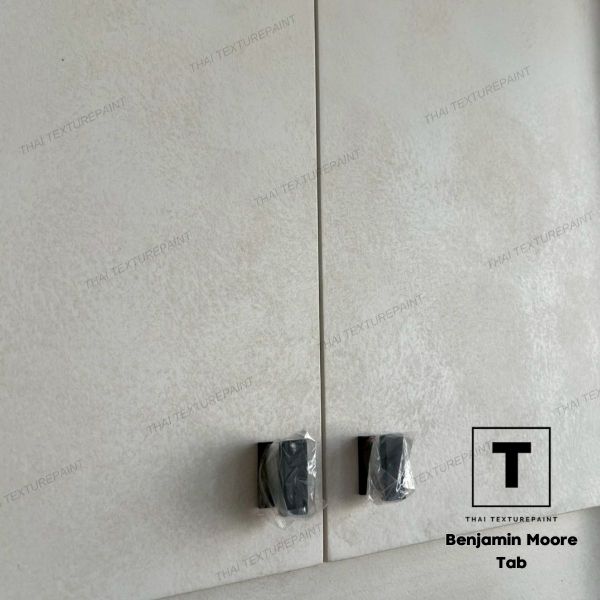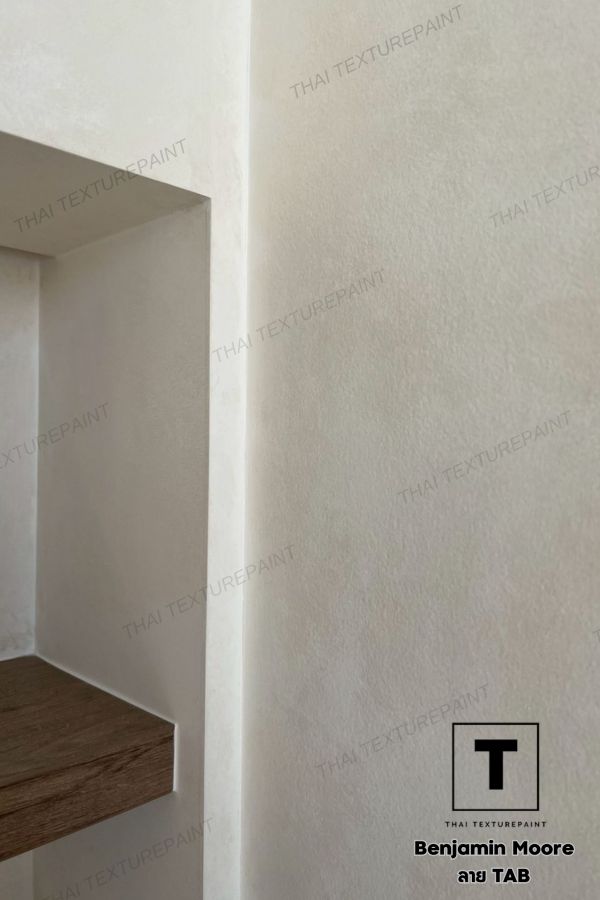 คือความเรียบ ความละมุน และความต่อเนื่องของดีไซน์ทั้งพื้นที่ งานนี้เจ้าของบ้านและผู้ออกแบบเลือกใช้ สีเท็กเจอร์ Benjamin Moore ลายแท็บ ลายที่ไม่ได้หวือหวา แต่ให้มิติผิวผนังแบบนุ่ม ๆ ดูอบอุ่น และดูแพงแบบเงียบ ๆ
